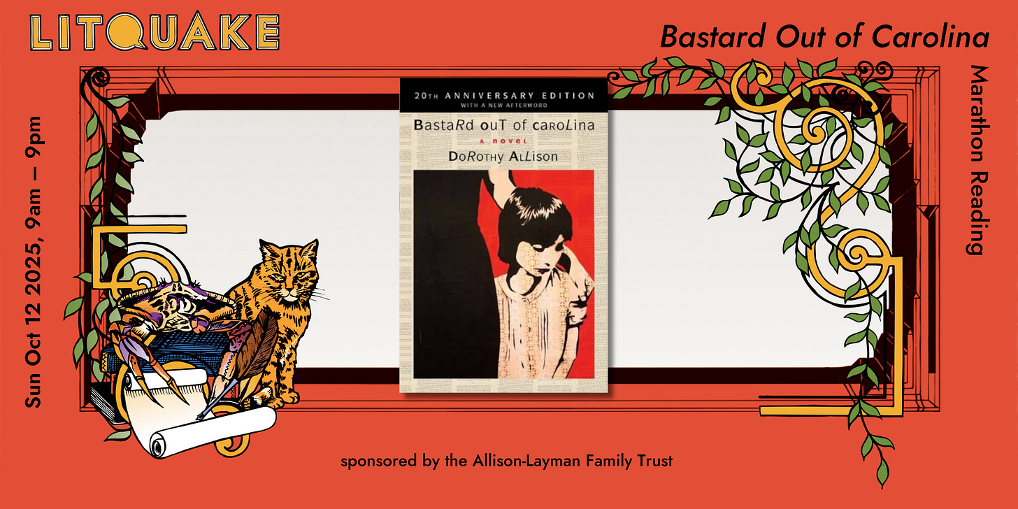 It took us a year, but her friends and family are staging a memorial event in Dorothy’s honor this fall— we’re throwing a marathon reading of Bastard Out of Carolina at this year’s LitQuake book festival.