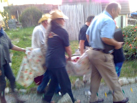 I asked Linda if I could go to Bob’s cabin by myself for a couple minutes, before we carried him out, so I could see how I’d handle it. I felt like a scared kid wandering in, but then I just started talking to him, and that relaxed me. I finally got the nerve to put my hand on his.