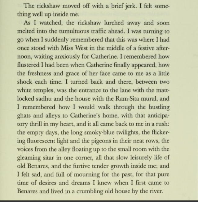 I turned back, and there, between two white temples, was the entrance to the lane with the mattlocked sadhu and the house with the Ram-Sita mural, and I remembered how I would walk through the bustling ghats and alleys to Catherine’s home, with that anticipatory thrill in my heart, and it all came back to me in a rush: the empty days, the long smoky-blue twilights, the flickering fluorescent light and the pigeons in their neat rows, the voices from the alley floating up to the small room with the gleaming sitar in one corner, all that slow leisurely life of old Benares, and the furtive tender growth inside me; and I felt sad, and full of mourning for the past, for that pure time of desires and dreams I knew when I first came to Benares and lived in a crumbling old house by the river.
