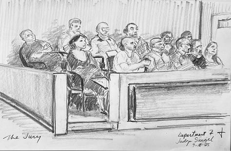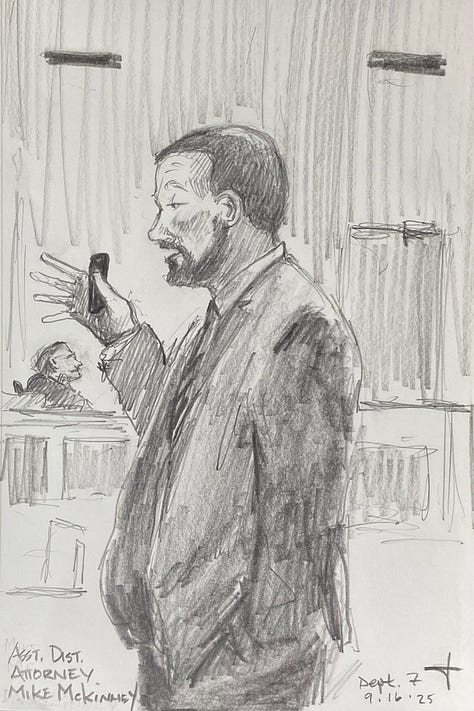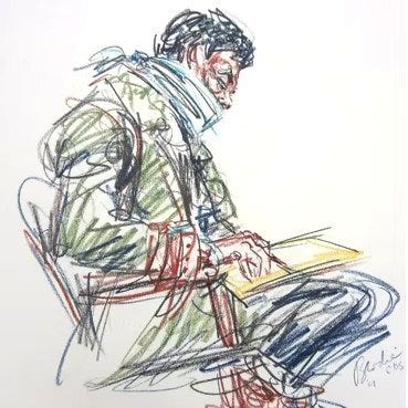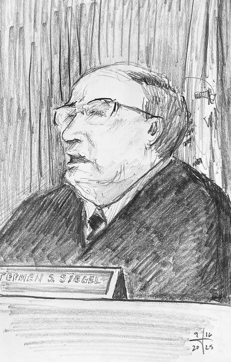 I attended the trial with my partner Jon Bailiff, who is talented in all manner of illustration and rendering. He drew everyone in court, live, and afterward, others came to look at his sketchbook.