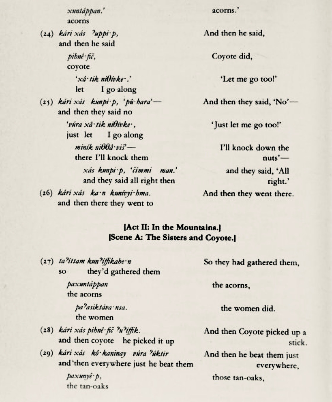 “My motive is to offer a sample of Coyote's adventures, translated in a style which aims to preserve as much as possible of Karuk literary structure, while still being accessible to English-speaking readers.