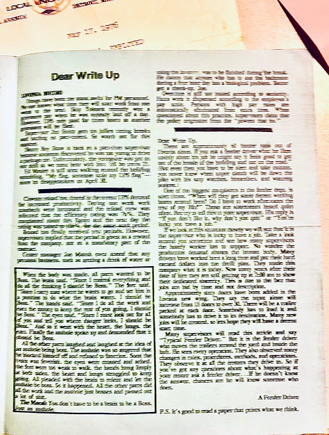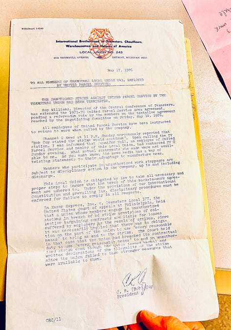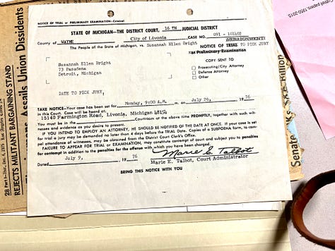 Bottom from left: Another page from The Write Up. The letter is the day the local Teamster honchos tried to call off our wildcat strike at Detroit UPS hubs. Finally, my court notice. We were all eventually pled out to “loitering” but it was far more serious to begin with, and we sat in our cells. The judge was the Julius Hoffman type: he scolded me, “Young lady, you are a menace to society.”