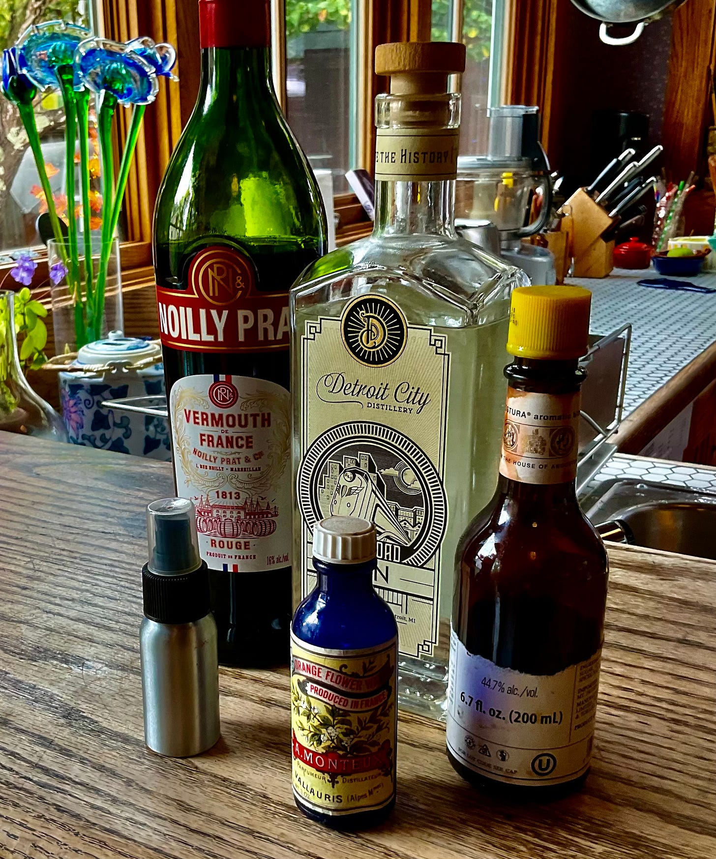2 oz. gin, ¾ oz. sweet vermouth, 2 dashes absinthe, 1 dash Angostura bitters, 1⁄24 oz. Orange Blossom water.